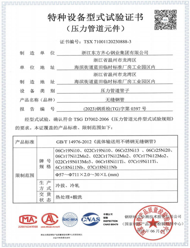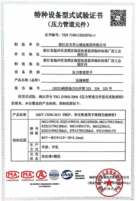浙江東方齊心以不銹鋼系列產(chǎn)品為主導(dǎo),品種有不銹鋼管、奧氏體不銹鋼管、高溫合金鋼管、雙相不銹鋼管、鎳基合金管、冷凝器用管、U形管、核電管、不銹鋼管件、法蘭、閥門等。規(guī)格有6-2020x0.8-60mm,Ф16-25長(zhǎng)度可達(dá)33m。公司擁有精密制造鋼管的各類機(jī)械設(shè)備25臺(tái)(套),其中各類冷軋管機(jī)15臺(tái), 冷拔機(jī)10臺(tái),天然氣熱處理爐2套。